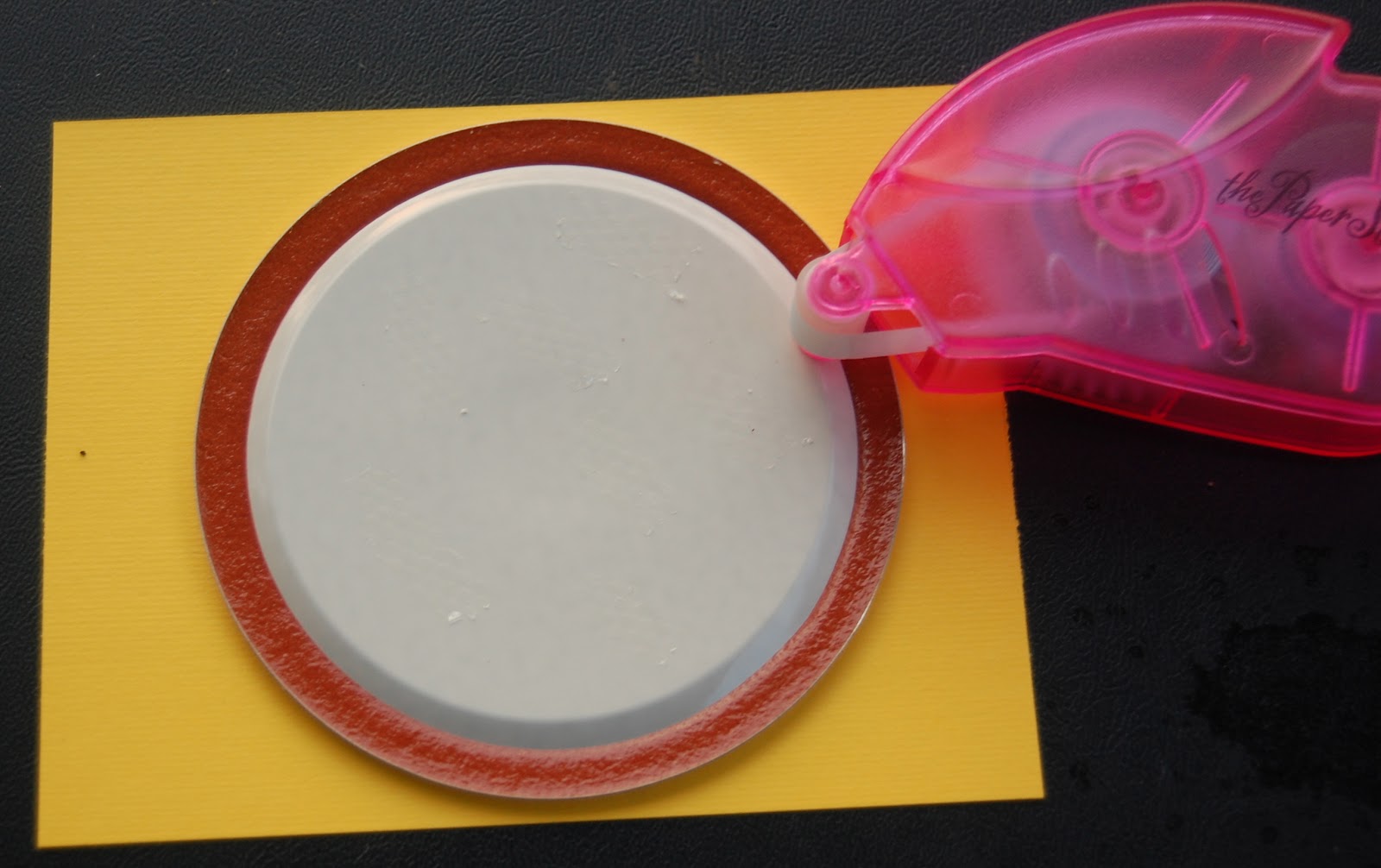 Next, use double sided tape or scrapbook adhesive to tape the canning lid and scrapbook paper to either side of the canning lid.